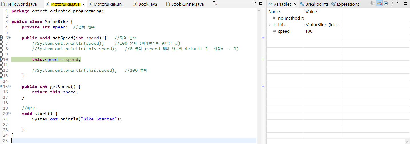 4. java 창을 더블클릭하면 아래 화면처럼 Variables, Breakpoints, Expressions 창을 함께 볼 수 있다.