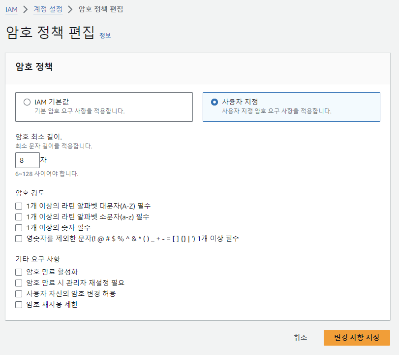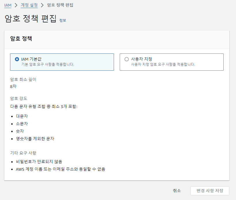 IAM 기본값으로 설정할 수 있고, 원하는 비밀번호 정책이 있다면 사용자 지정을 선택하여 설정한다.