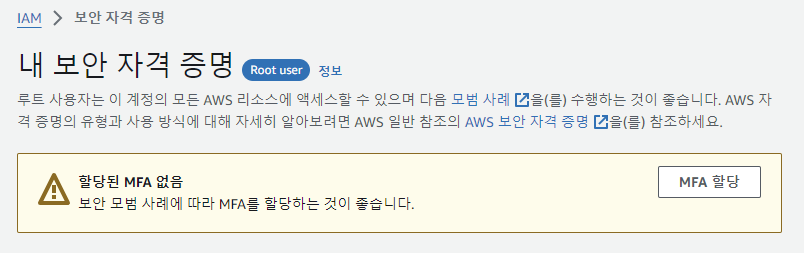 오른쪽 상단의 사용자 계정 > 보안 자격 증명(Security Credientials)에서 MFA를 할당할 수 있다.